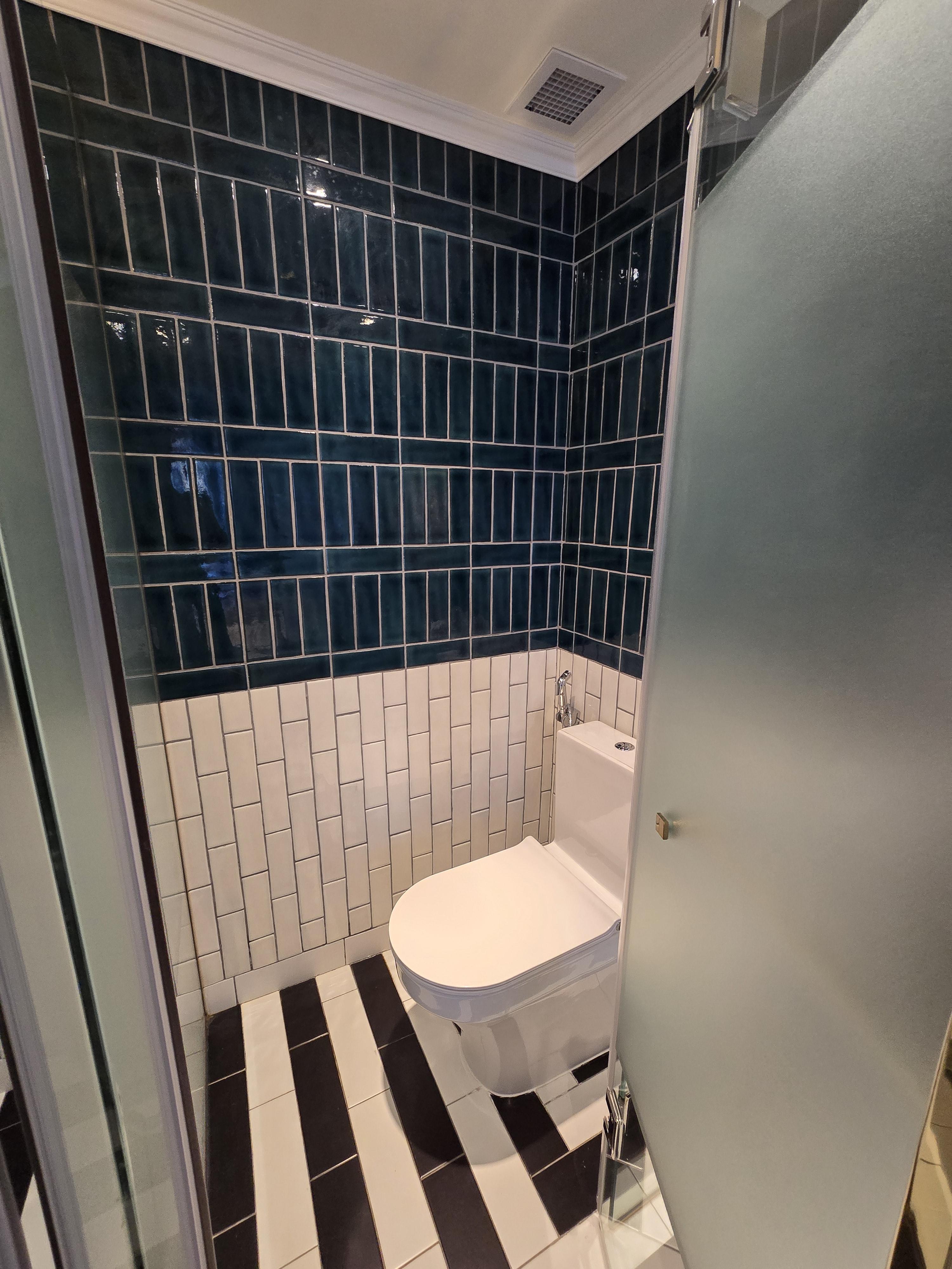 바닥에 저 타일 한 칸 정도만 화장실 안쪽으로 들여서 유리 벽면을 설치했으면 어땠을까 하는 아쉬움이 들었어요.