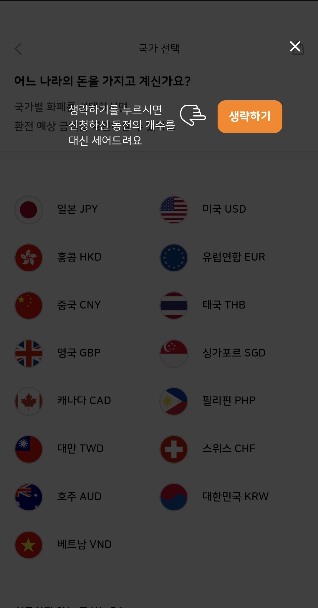 이때 본인이 가지고 있는 동전을 국가별로 확인해 기입해 주셔도 되고 여러 동전이 섞여있는 경우 생략하고 보내기를 선택하셔도 됩니다.